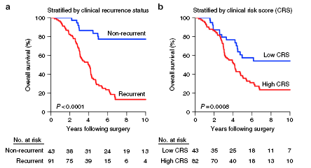 这是一项回顾性临床队列研究,患者均具有有限(1-5个转移灶累及一个或二个肝叶)、可切除新发CRC肝转移(CRCLM),统一接受手术治疗。共134例接受了有限CRCLM肝脏手术治疗,随访49个月,32%患者无复发,10年总生存(OS)77%,而复发患者10年OS仅13%(图1a)。根据临床风险评分(CRS),低CRS患者的10年OS明显优于高CRS患者,分别为62%和22%(图1b)。