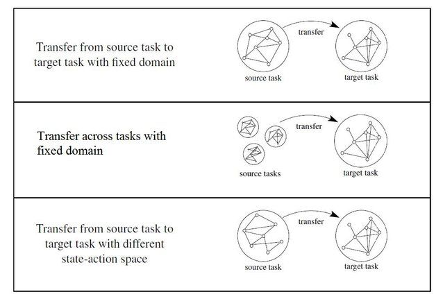 2)跨多个源任务到目标任务的固定域迁移。在这种情况下,任务共享相同的域,迁移算法将以从一组源任务中收集到的知识作为输入,并使用它来改进在目标任务中的表现。