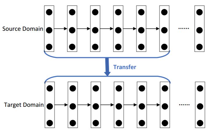 3)源任务和目标任务不同域迁移。在该设置中,任务有不同的状态-动作空间,无论是在数量上还是范围上。在这种情况下,大多数迁移方法都着重于如何定义源状态-动作变量和目标变量之间的映射,以便获得有效的知识迁移。