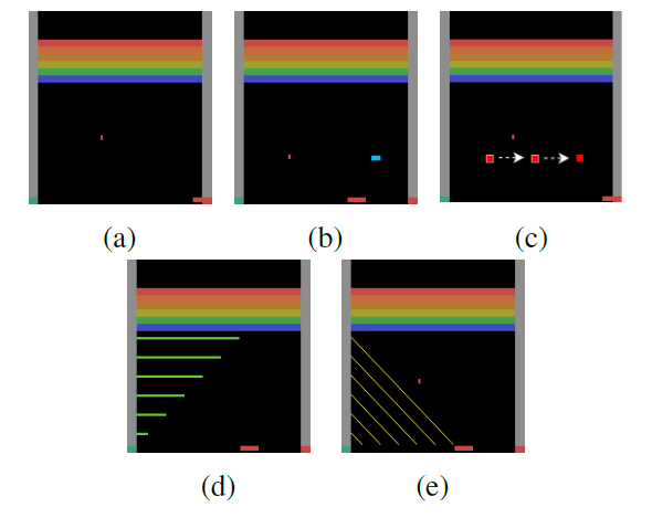 图 2 :(a) 为原始版本的打砖块游戏,其余为在背景上添加了一些小的视觉变化。(b) 添加固定蓝色矩形干扰,(c) 红色矩形在三个固定位置闪现 (d) 绿色线条干扰 (e) 对角线干扰。