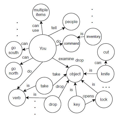 知识图是一个有向图,由一组语义三元组(主体,关系,对象)构成。在本文中,作者探索使用知识图和相关的神经嵌入作为域知识迁移的表示形式,以训练文字类冒险游戏的强化学习 agent,从而减少训练时间并提高所学习控制策略的质量。作者在 KG-DQN 的基础上展开他们的工作,探索知识图和网络参数的迁移。从静态文本资源中提取出 graph,并使用它向 agent 提供特定领域的词汇,对象能力等知识。agent 也能访问游戏解析器接收到的所有 action,通过提取解析器接收到的一系列模板(用 OBJ 标记替代 action 中的 object 或者名词短语),将 OBJ 标记更换为游戏给定词汇中可能的 object 即可。DQN 网络由两个独立的神经网络构成,分别编码 state 和 action,由最终的 state-action 对的 Q 值作为两个网络之间交互的结果,使用贝尔曼方程更新。