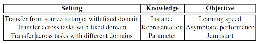表 2:RL 中迁移学习的三个维度。每个迁移解决方案都是为特定设置设计的,传输某种形式的知识,追求某一目标。