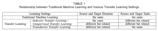 表 1:传统机器学习与各种迁移学习设置之间的关系。