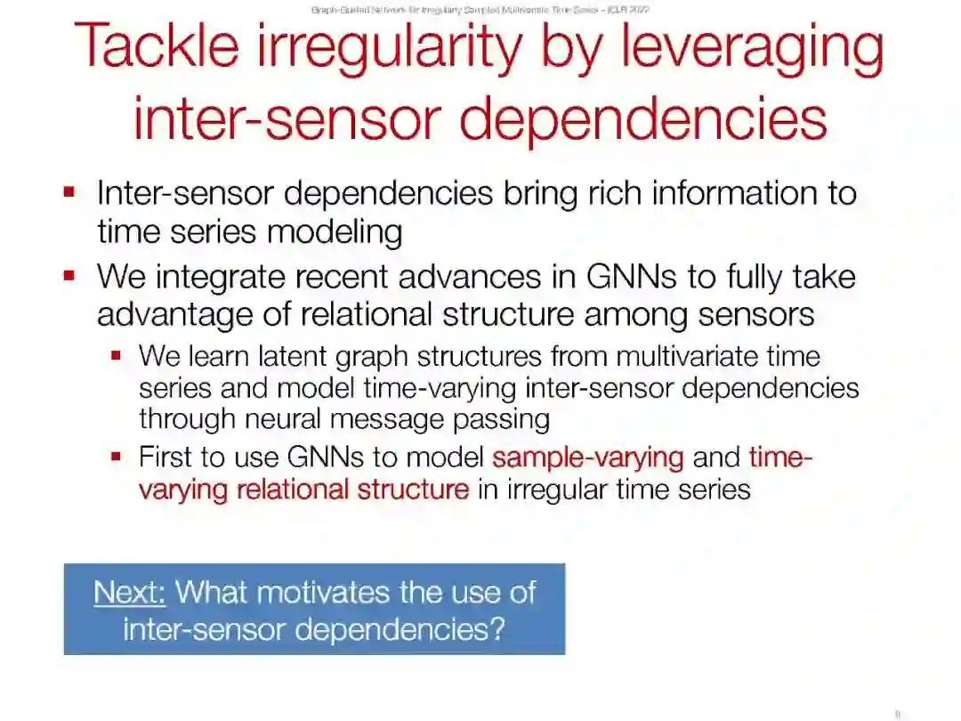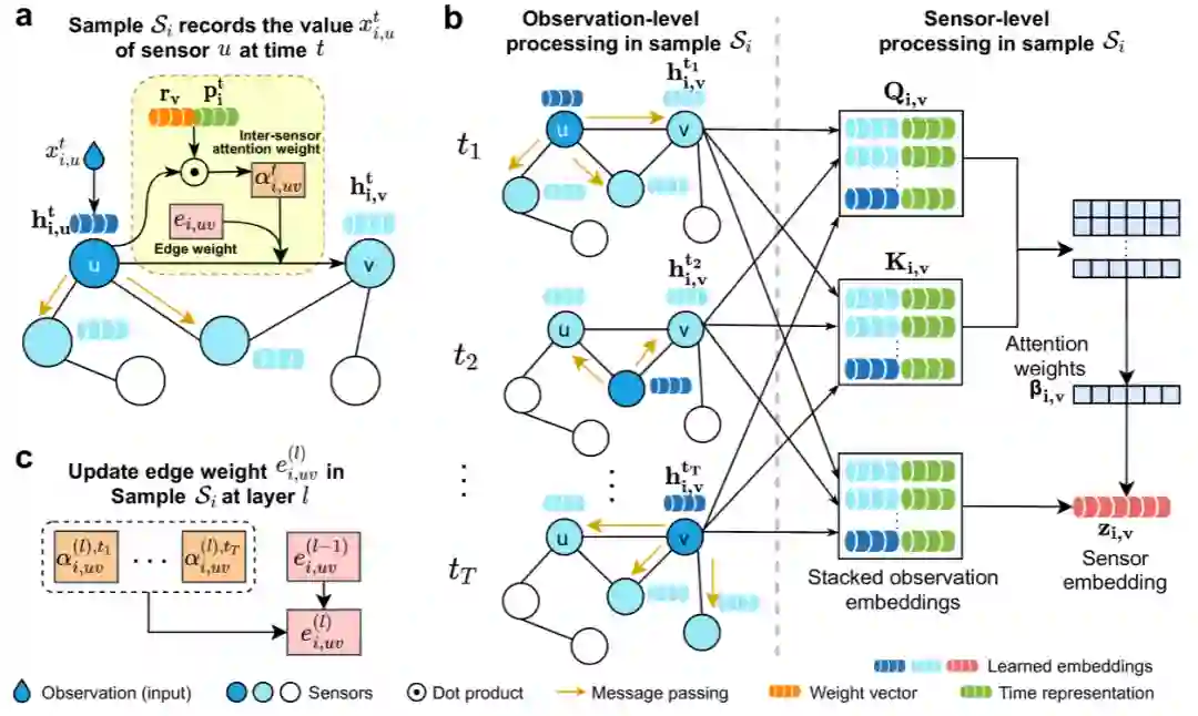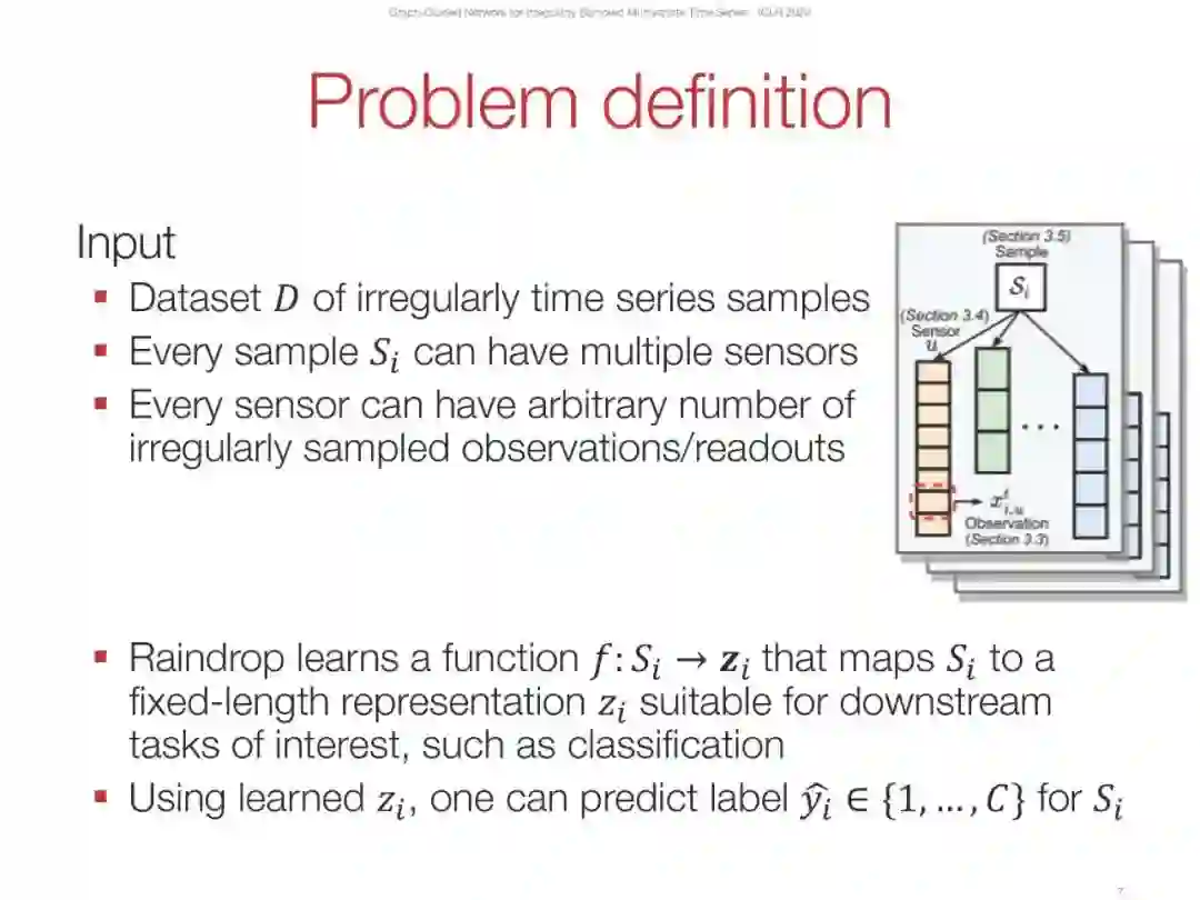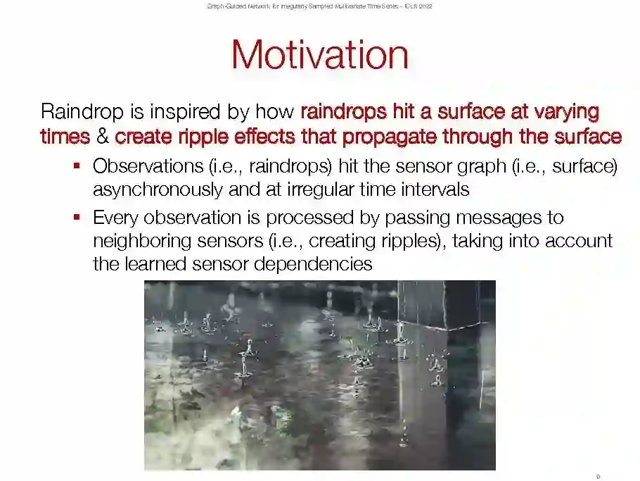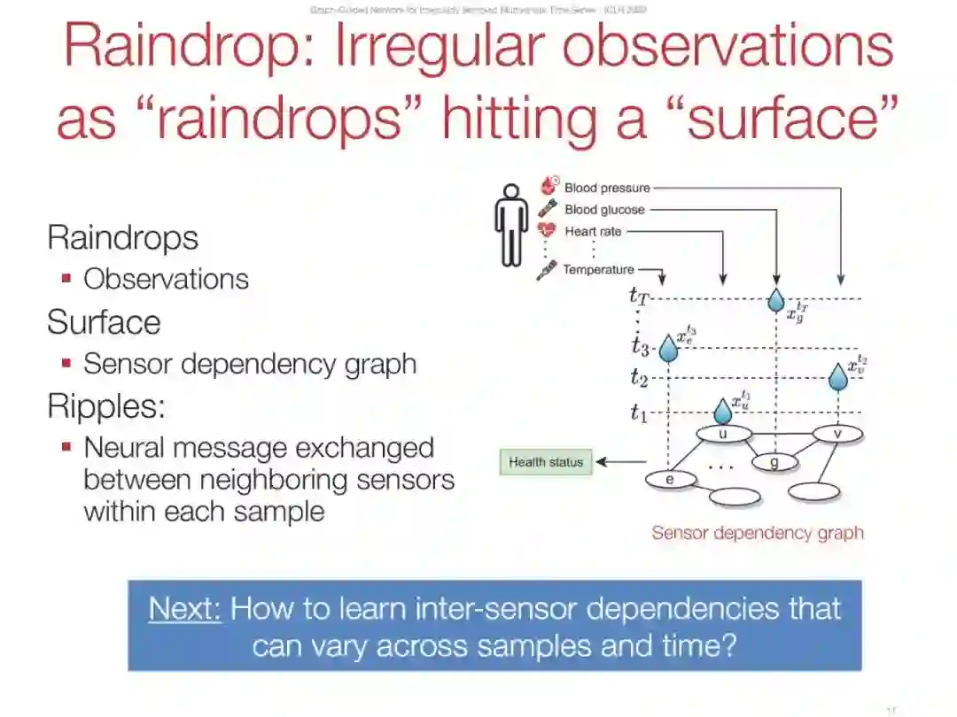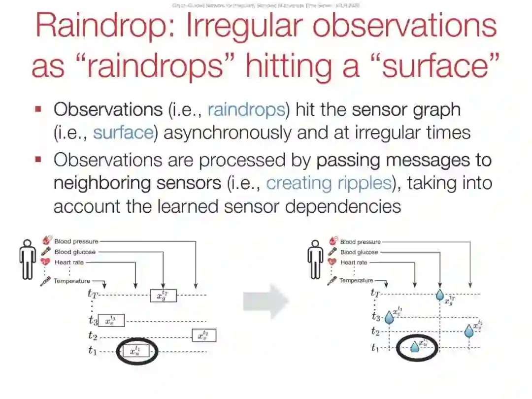 RAINDROP将每个样本表示为一个单独的传感器图,并使用一种新的消息传递操作符对传感器之间的时变依赖关系进行建模。它估计了潜在的传感器图结构,并利用该结构与附近的观测结果预测误差读数。这个模型可以解释为一个图神经网络,它通过为捕捉传感器之间时变依赖关系而优化的图发送消息。我们使用RAINDROP对三个医疗保健和人类活动数据集进行时间序列分类和解释时间动态。RAINDROP的表现比最先进的方法高出11.4%(绝对f1得分),包括使用固定离散化和集合函数处理不规则采样的技术。RAINDROP在不同的设置中显示了优势,包括具有挑战性的离开传感器的设置。