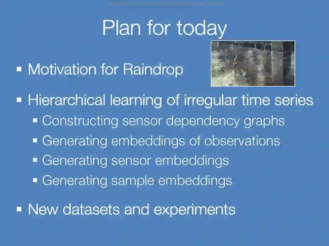 我们介绍Raindrop,一个图神经网络,学习嵌入不规则采样和多元时间序列,同时学习传感器的动态纯粹从观察数据。Raindrop可以处理不对齐的观测、变化的时间间隔、任意数量的观测,从而通过神经信息传递和时间自注意力产生固定维嵌入。