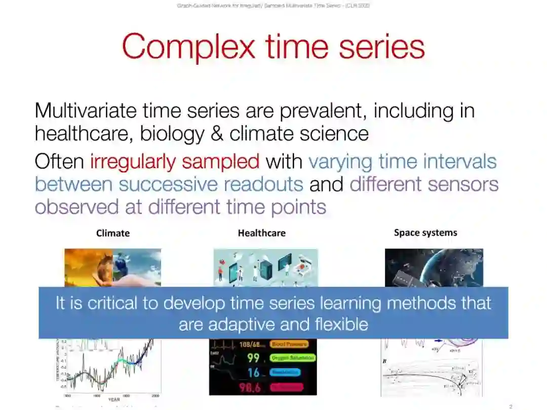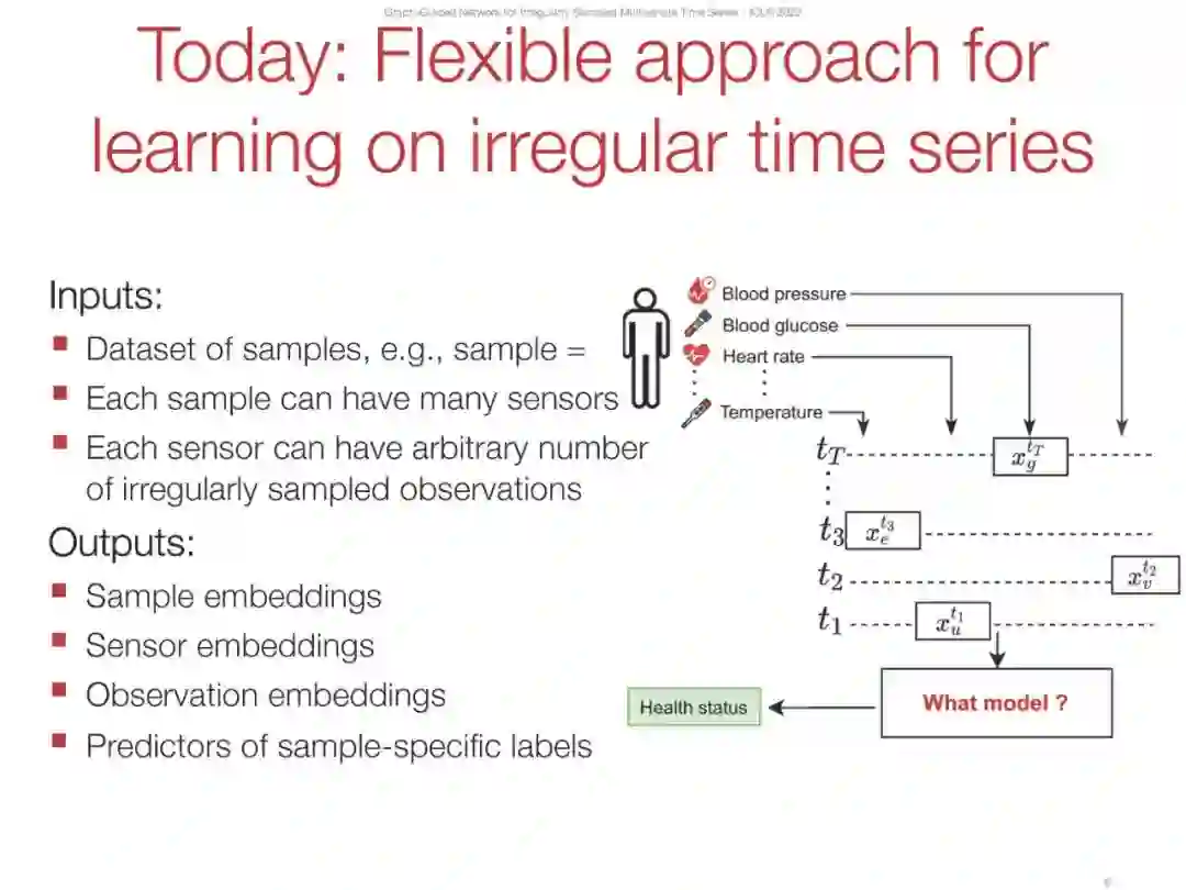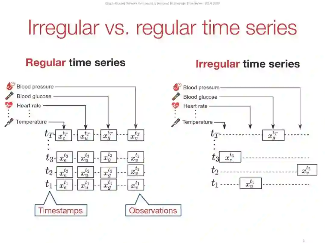 在许多领域,包括医疗保健、生物和气候科学,时间序列是不规则的采样,连续读数之间的时间间隔不同,不同的变量子集(传感器)在不同的时间点观测。在收集传感器测量数据时,经常存在一些实际问题,这些问题会导致各种类型的不正常现象,例如成本节约、传感器故障、物理场景中的外部力量、医疗干预等等。