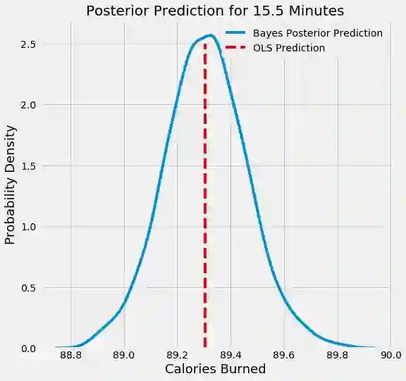 当使用我们的贝叶斯线性模型预测单个数据点的输出时,我们仍然不是得到单一的值,而是一个分布。下面是 15.5 分钟的运动所消耗的卡路里的概率密度图。红色的垂直线代表 OLS 的估计值。