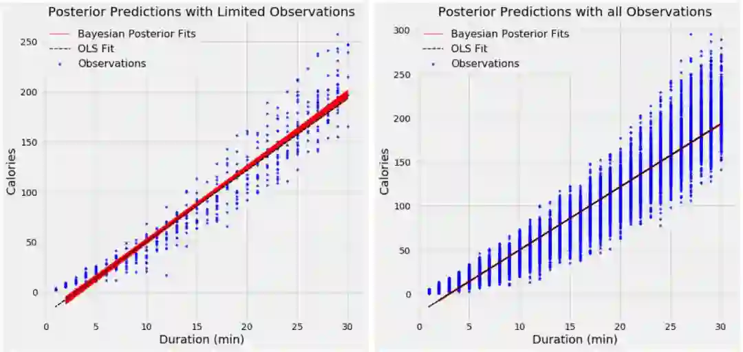 使用 500 个(左图)观测值和 15,000 个(右图)观测值的贝叶斯线性回归模型的结果
