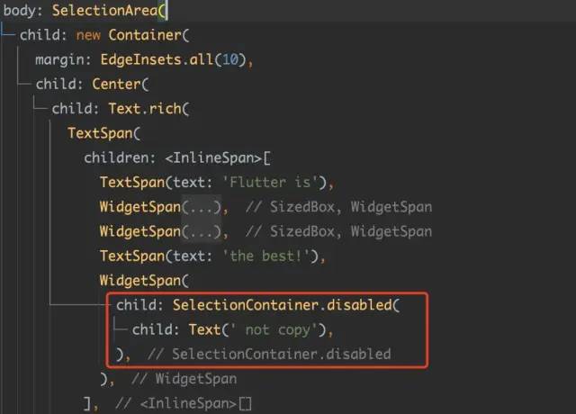 这里 Flutter 提供了 SelectionContainer.disabled 实现,只要在对应内容嵌套 SelectionContainer.disabled,那么这部分内容下的文本就无法被选中。
