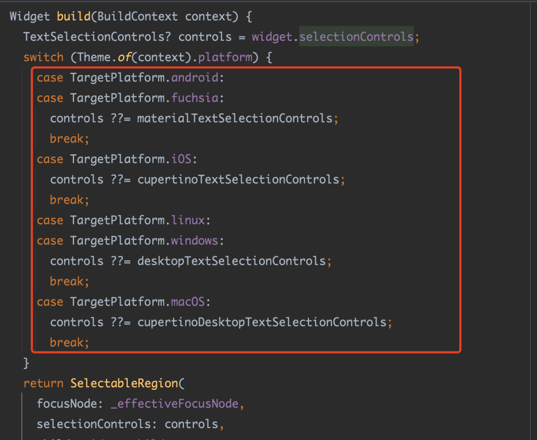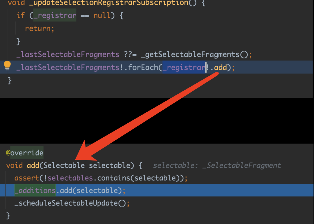 SelectionContainer 内部实现了一个 InheritedWidget,它会往下共享一个 SelectionRegistrar,而默认情况下 SelectionArea 内部使用了 SelectionContainer 并且往下共享了对应的 Registrar 实现。