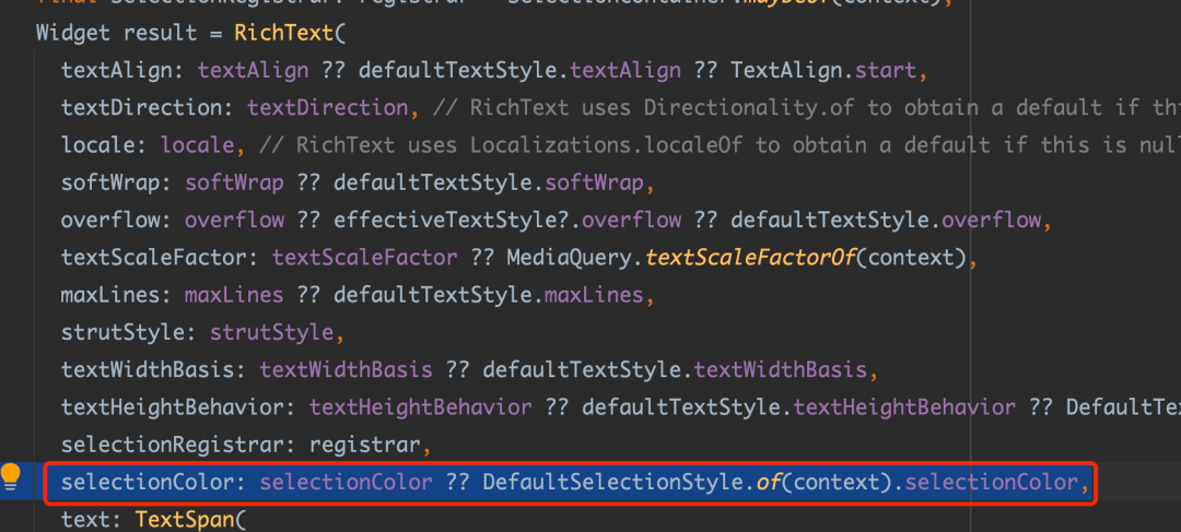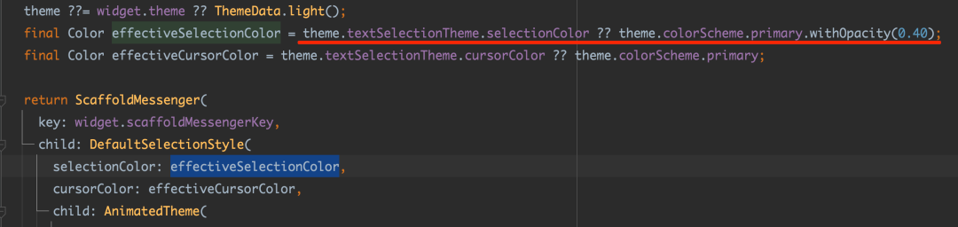 而对于文字的选中区块的颜色,默认是通过 DefaultSelectionStyle 的 selectionColor 来显示,当然,如下第二张图所示,在 MaterialApp 里它依然和 TextSelectionTheme 的 selectionColor 或者 Theme 的 primary 有关系。