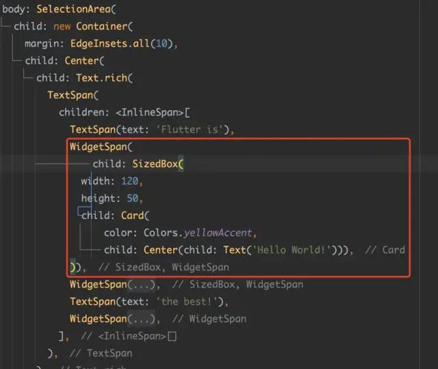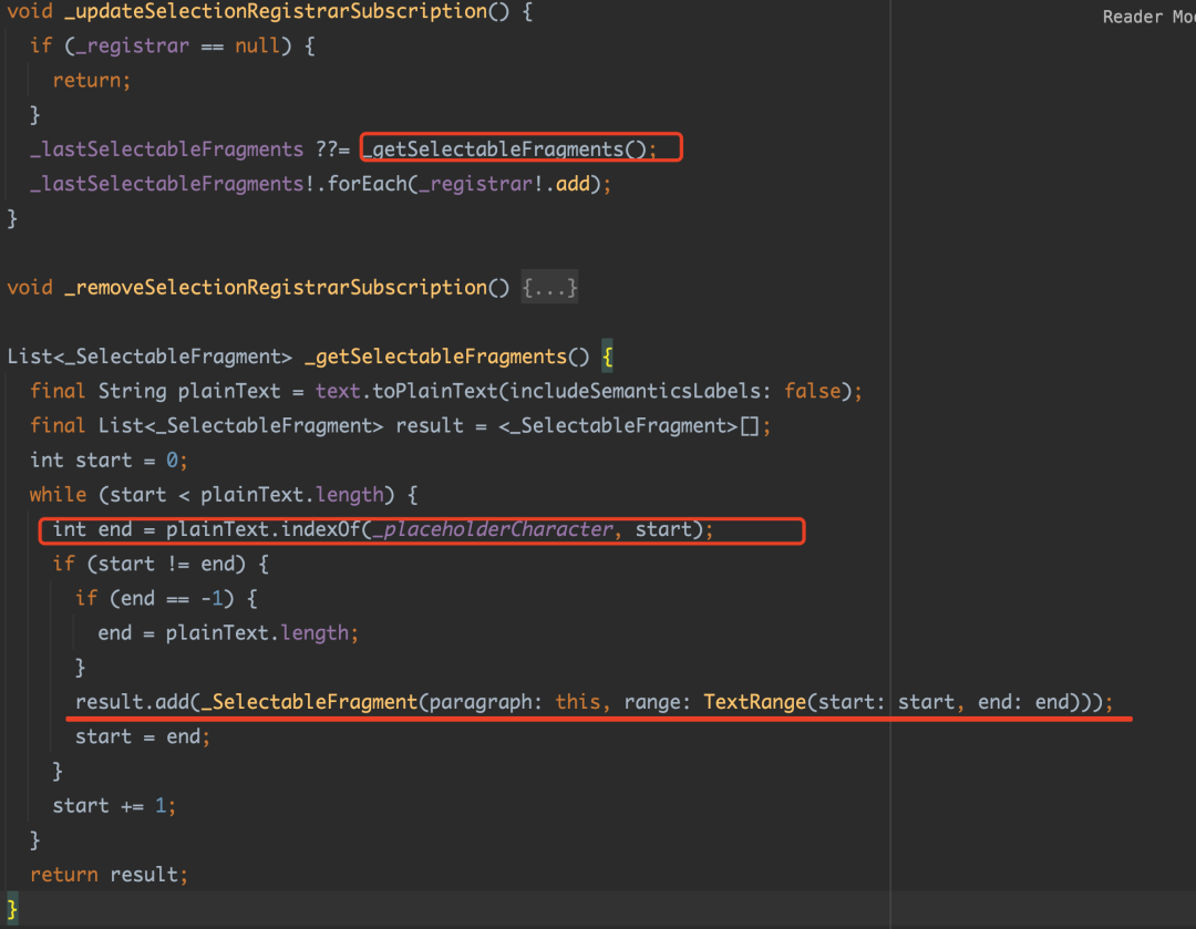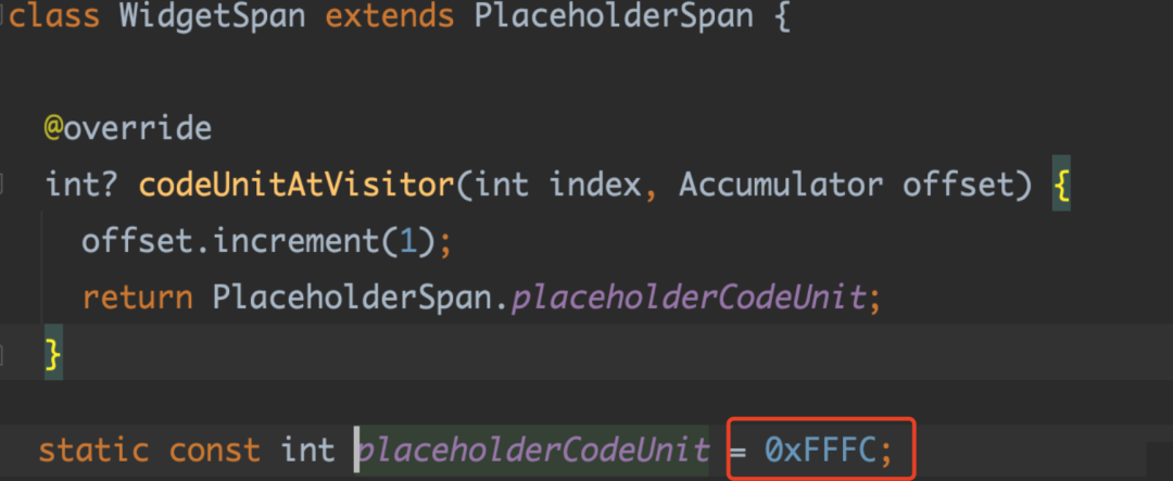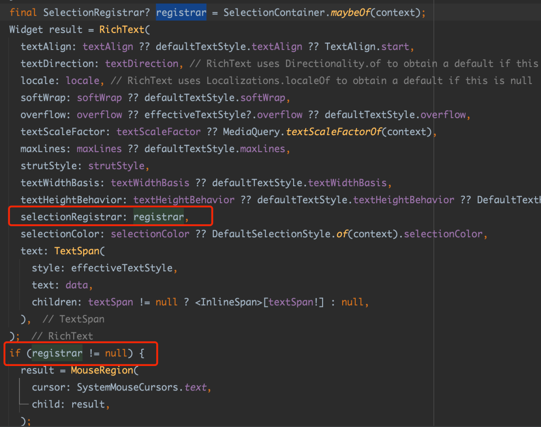 如下代码所示,「当使用了 WidgetSpan 之后,默认情况下,用户在开始位置拖拽 Handle 进行选择时会无法选中 WidgetSpan 里的文本」。