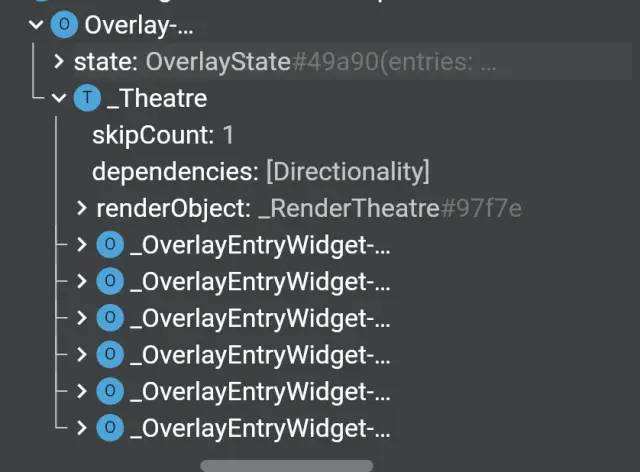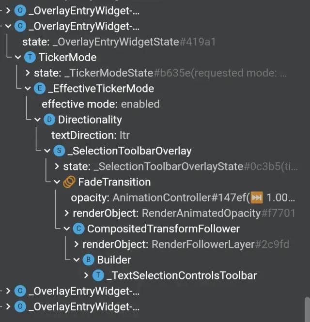 所以 Handle 和 Toolbar 都是通过 OverlayEntry 打开的特殊 "路由" 控件,拥有新的层级,例如下方右图就是 Toolbar 所在的 OverlayEntry。