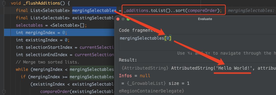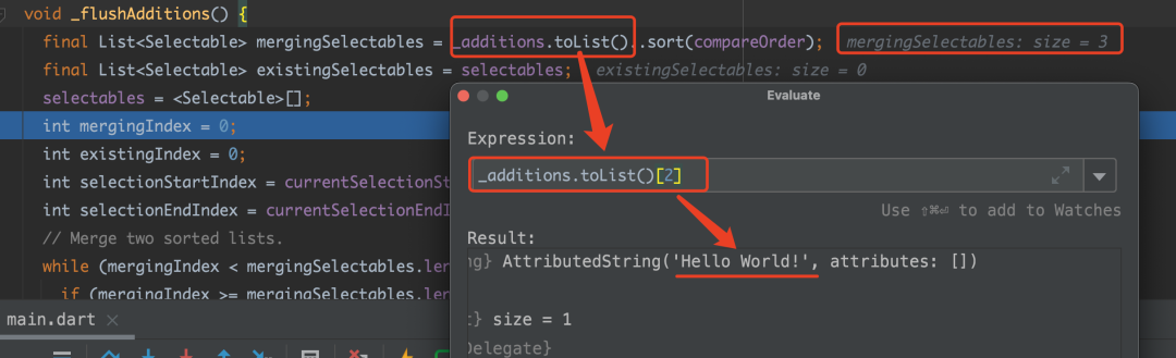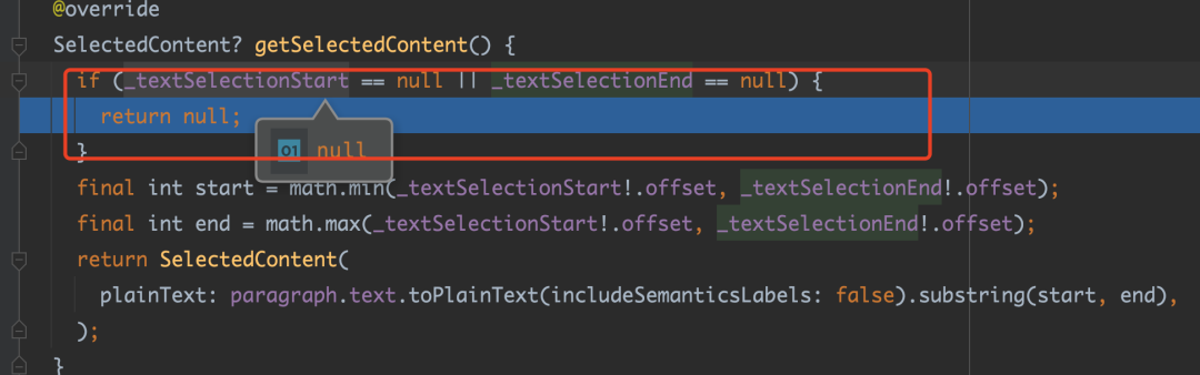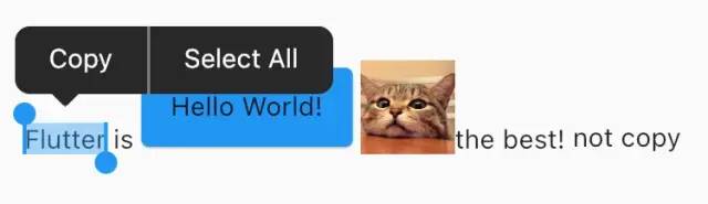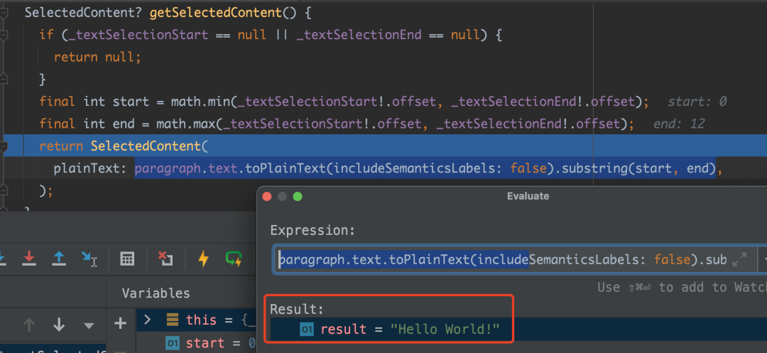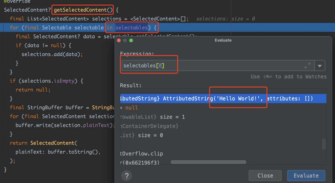 正如前面说到的,复制调用的是 getSelectedContent 方法,如下代码所示,「可以看到在 selectables 这个 List 的第一位就是 Hello World,所以最终拼接出来的文本会是 Hello World!Flutter isthe best!」 。