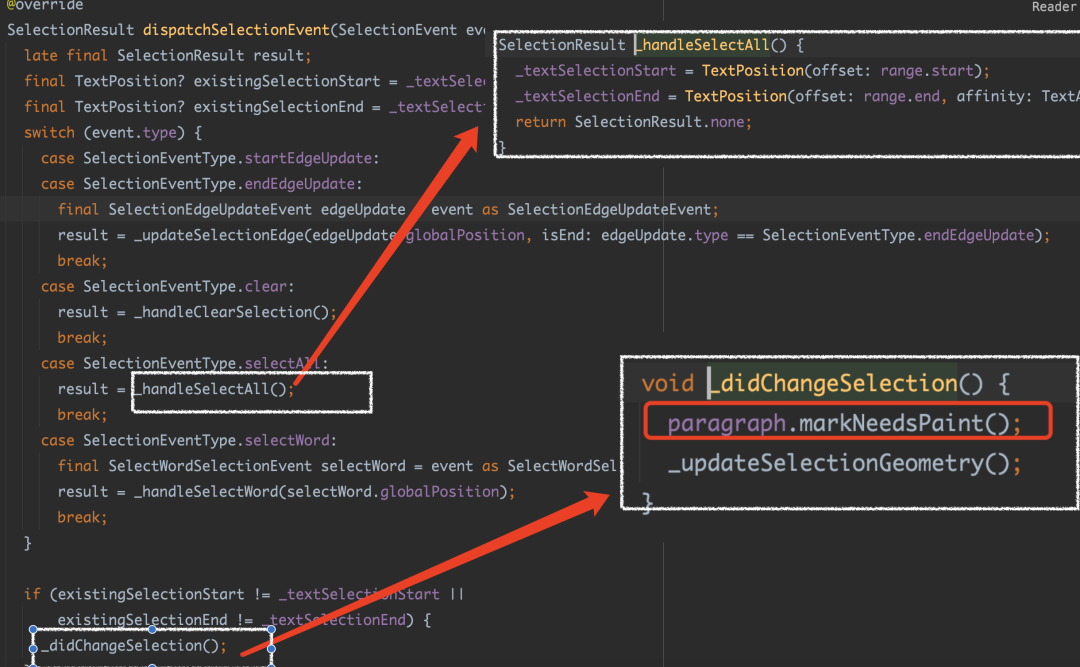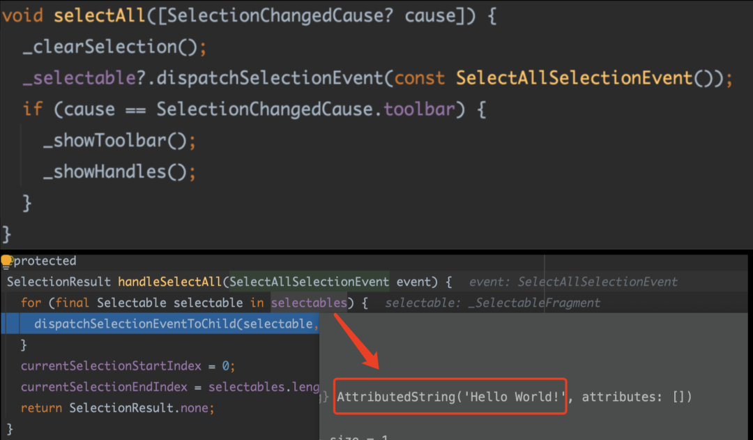 其实全选操作和拖拽 Handle 最大的不同就是: 它是往下直接发出全选事件 SelectAllSelectionEvent,而该事件会触发所有 child 响应事件,自然也就包括了 WidgetSpan 里的 Hello World。