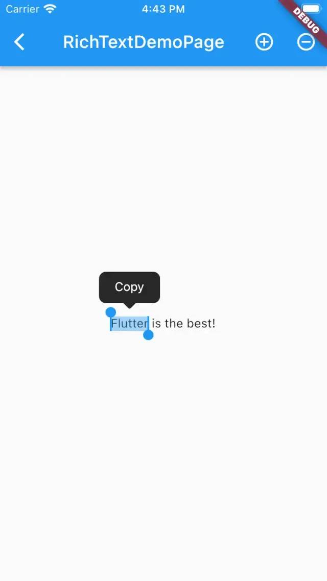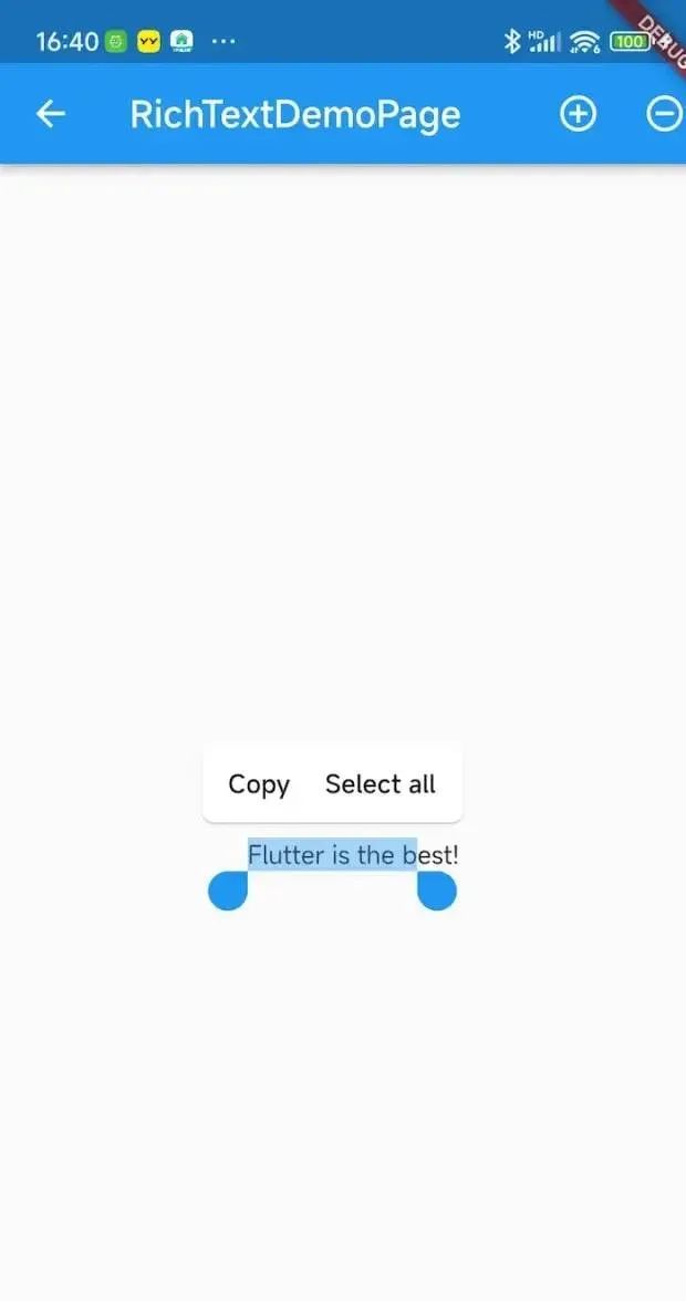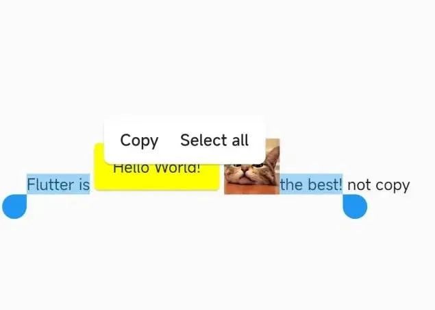 默认情况下 SelectionArea 已经实现了所有常见的功能,并且 Flutter 针对不同平台进行了差异化实现,如下图所示 Android 和 iOS 会有不同的样式效果。
