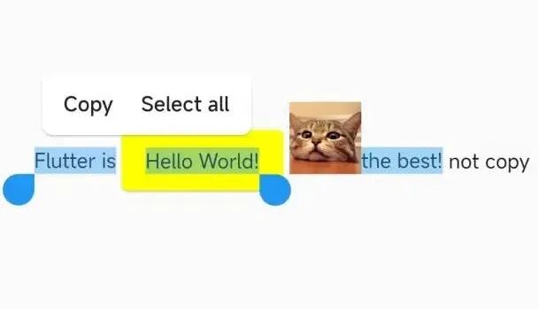 当然, 「其实在拖动 Handle 还是可以选中 WidgetSpan 里的文本,比如您从 Hello World 开始拖动,这里拖动选中不了的原因后面会解释」。