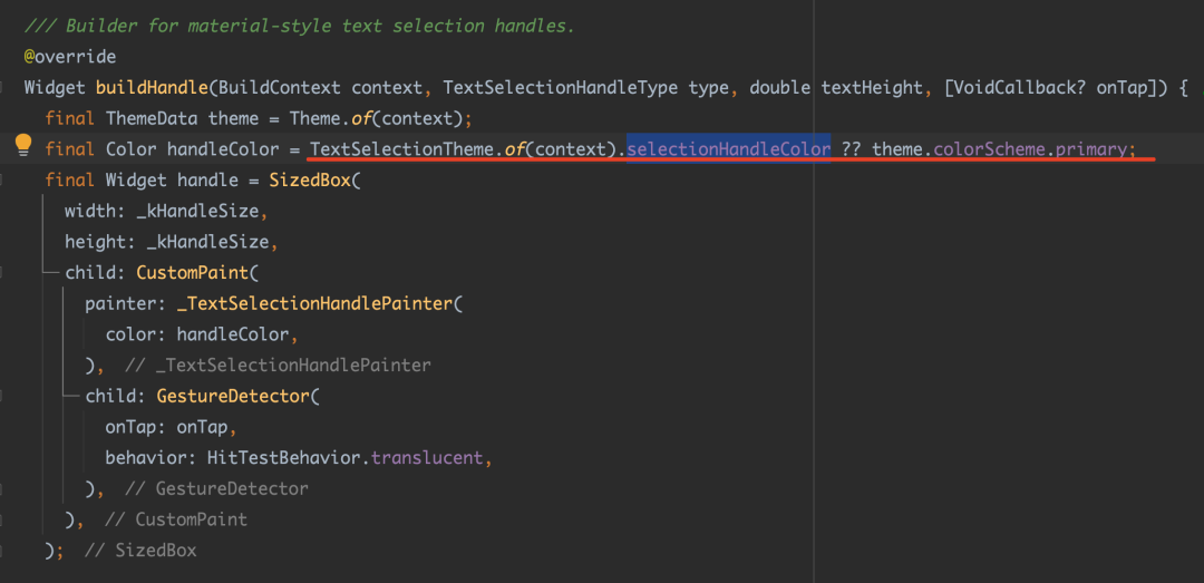 例如 MaterialTextSelectionControls 里,start 和 end 两个 Handle 的颜色,默认是通过 TextSelectionTheme 的 selectionHandleColor 或者 Theme 的 primary 来设置。