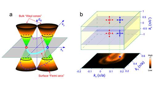 Weyl 半金属中 Weyl 锥的示意图和实验观测到的费米弧