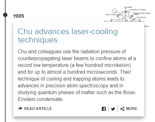 1985 年,朱棣文等人发明了激光冷却原子技术,并获得 1997 年诺贝尔物理学奖。