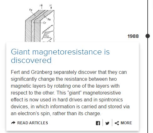 1988 年,Fert 和 Grünberg 独立发现巨磁阻效应,并获得 2007 年诺贝尔物理学奖。