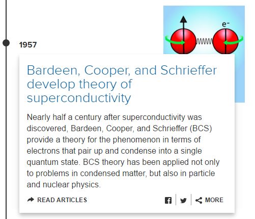 1957 年,巴丁、库珀和施里弗提出 BCS 理论解释了近 50 年悬而未决的超导现象,并因此获得 1972 年诺贝尔物理学奖。