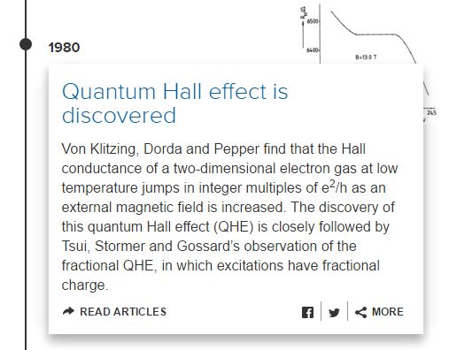 1980 年,量子霍尔效应被发现,冯·克利青因此获得 1985 年诺贝尔物理学奖。