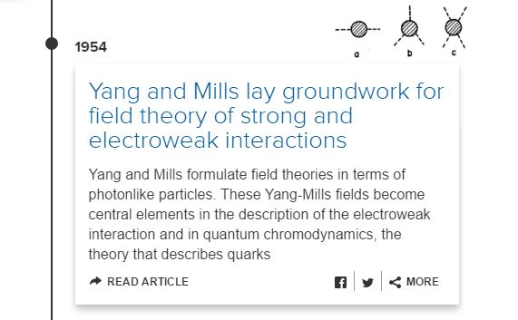 1954 年,杨振宁和米尔斯提出非阿贝尔规范场论,即杨-米尔斯理论,为标准模型的创建打下基础。