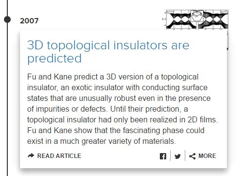 2007 年,傅亮和 Kane 发表理论文章预言三维拓扑绝缘体的存在。