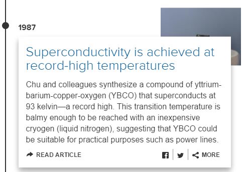 1987 年,朱经武等人发现钇钡铜氧(YBCO)超导体具有 93K 的超导转变温度。
