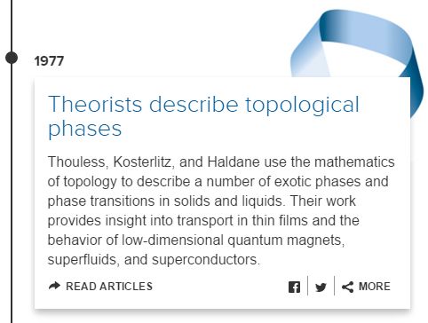 1977 年,Thouless 等人提出了拓扑相和拓扑相变的概念,并因此获得 2016 年诺贝尔物理学奖。