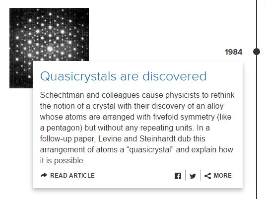 1984 年,准晶被发现,谢赫特曼因此获得 2011 年诺贝尔化学奖。