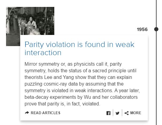 1956 年,宇称不守恒被证实,杨振宁和李政道因此获得 1957 年的诺贝尔物理学奖。