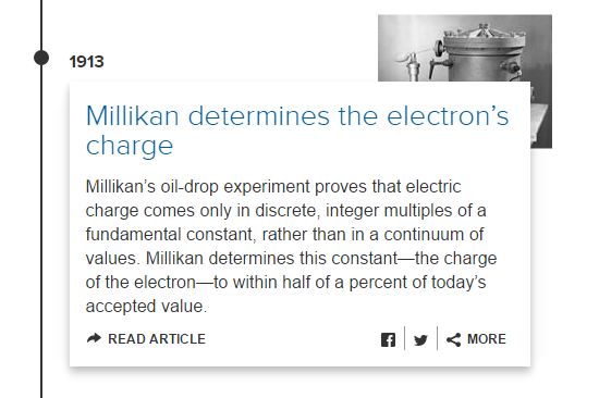 1913年,密立根油滴实验测定电子电荷,密立根创造性地提出油滴实验测定电子电荷的大小,用在电场和重力场中运动的带电油滴进行实验,发现所有油滴所带的电量均是某一最小电荷的整数倍,该最小电荷值就是电子电荷,并因此获得1923年的诺贝尔物理学奖。