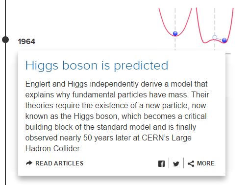 1964 年,Englert 和 Higgs 预言了现在称为“上帝粒子”的 Higgs 玻色子,解释了质量的起源,2013 年 Higgs 获得诺贝尔物理学奖。