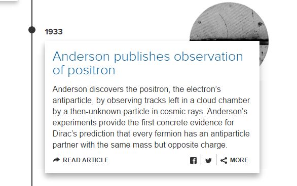 1933 年,安德森发现正电子,开辟了反物质的研究领域,证实了狄拉克的理论预言,并因此获得 1936 年的诺贝尔物理学奖。