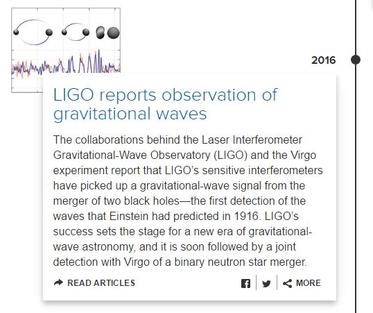 2016 年,LIGO 发现引力波,并因此获得 2017 年诺贝尔物理学奖。