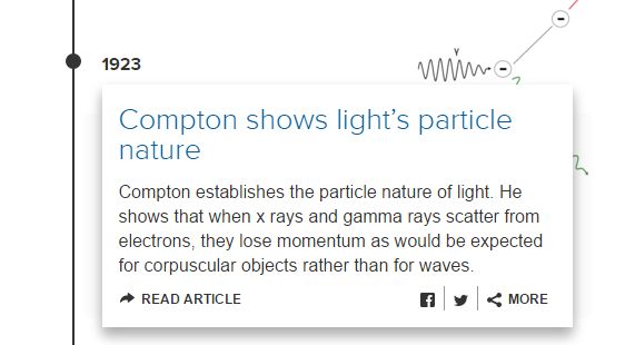 1923 年,康普顿以《X射线受轻元素散射的量子理论》为题发表在 Physical Review 上的一篇文章提出了被称为康普顿散射的现象,展示了光的粒子特性,因此获得 1927 年诺贝尔物理学奖。
