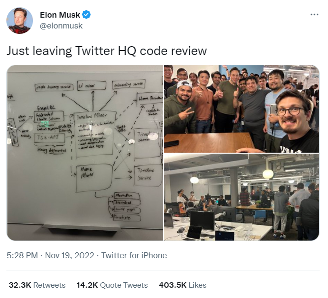 「刚刚离开Twitter HQ代码审查」,这位亿万富翁在推文中写道。
