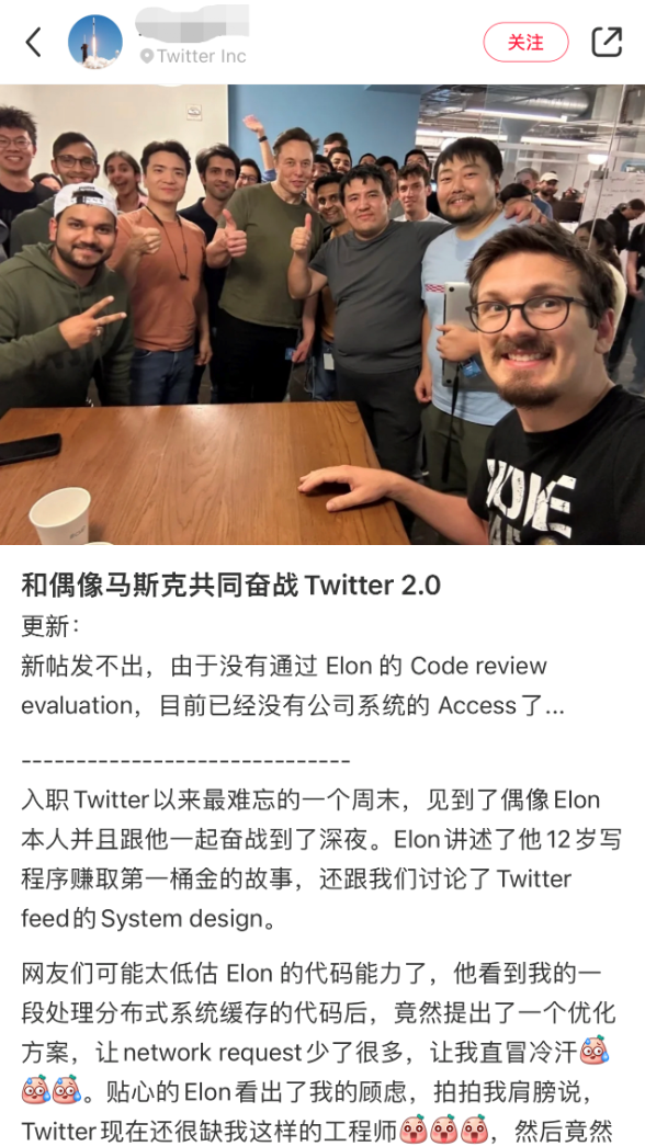 更尴尬的是,在与马斯克「并肩奋战」至深夜后,一位在Twitter工作的网友在小红书发帖表示: