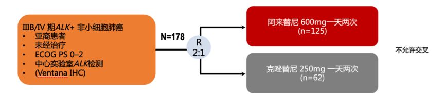 ALK阳性的患者占NSCLC患者的5%,东西方NSCLC患者中,ALK阳性患者比例相当。本研究是第一个随机Ⅲ期研究,仅招募亚裔人群,对比阿来替尼(600mg,bid)和克唑替尼用于ALK阳性的NSCLC患者。ALESIA研究与全球Ⅲ期ALEX研究一致,旨在评估阿来替尼对比克唑替尼的无进展生存(PFS)获益。ALESIA研究在中国、韩国、泰国21个研究中心入组,要求患者为亚裔人群,年龄18岁或以上,ALK阳性的NSCLC,随机2∶1分配接受阿来替尼(600 mg)或克唑替尼(250 mg)治疗。分层因素包括ECOG PS评分和基线的CNS转移。允许无症状的CNS转移患者入组。主要研究终点为研究者评估的PFS。主要的疗效分析人群为意向性人群(ITT人群),定义为所有随机的患者。主要的安全性分析人群定义为至少接受过1次研究药物治疗的患者。