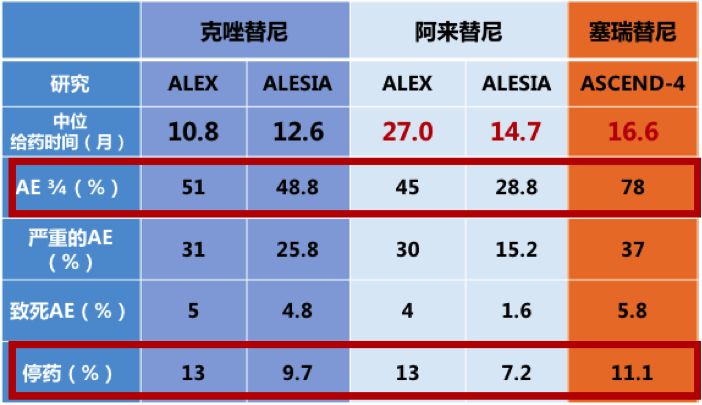 最后,从安全性角度而言,在ALEX研究中,阿来替尼对比克唑替尼显示出更优的安全性,即使中位给药时间最长,但3~4度不良事件(AE)和停药的患者比例更低。而在ASCEND-4研究中,塞瑞替尼的安全性甚至差于化疗,因不良反应事件导致剂量调整和中断的患者比例较高。3个药物的安全性对比总结见表3,在整体耐受性评估上,阿来替尼作为使用最长的药物,具有更优异的安全性。