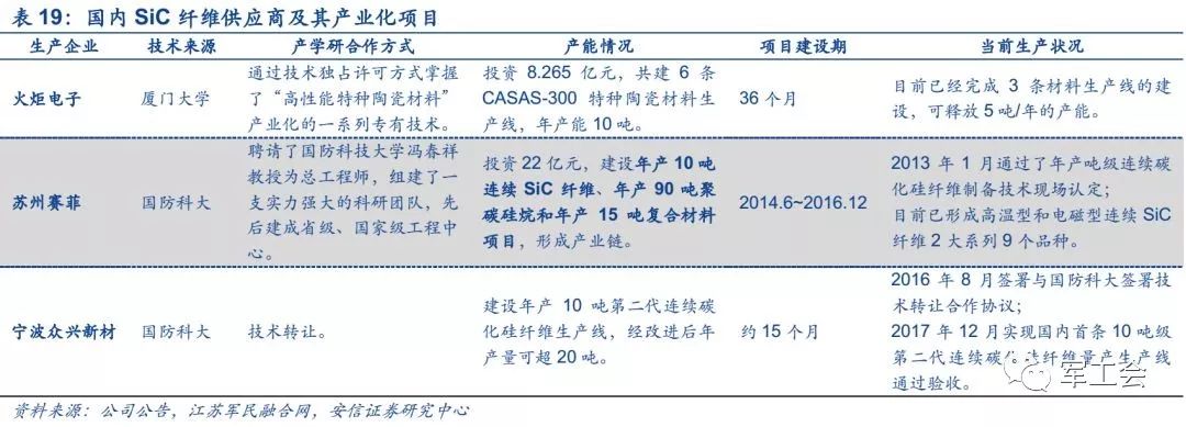 国内CMC材料制备商:西安鑫垚陶瓷复合材料有限公司、西安超码科技有限公司、中航复合材料有限责任公司等多家公司公司均有CMC相关业务。根据张立同院士2006年在第十四届全国复合材料学术会议上的论文中的表述“我国已经打破国际封锁,自主攻克了碳化硅陶瓷基复合材料构件批量制造技术,但是由于缺少高性能SiC纤维,目前只能用碳纤维代替”判断,碳化硅纤维的量产将直接推动相关CMC材料的量产,进而推动我国碳化硅陶瓷基复合材料的大量应用。