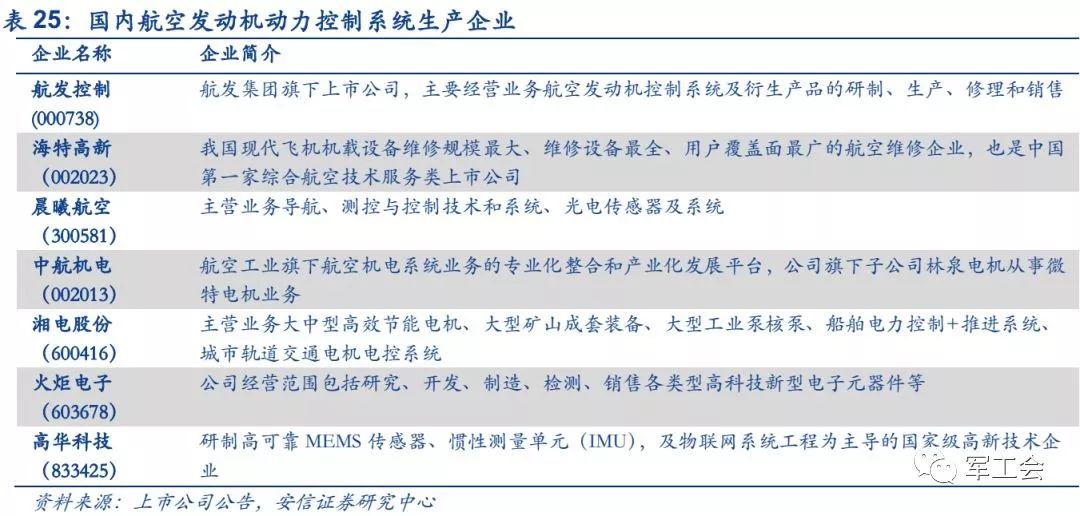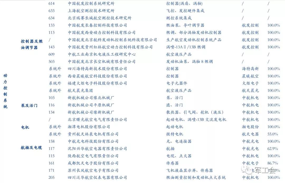 动力控制系统其他部件如电缆、传感器、电机、元器件等方面,军工股上市公司有中航机电、湘电股份、航天电器、中航光电,民营企业上市公司有火炬电子、高华科技。