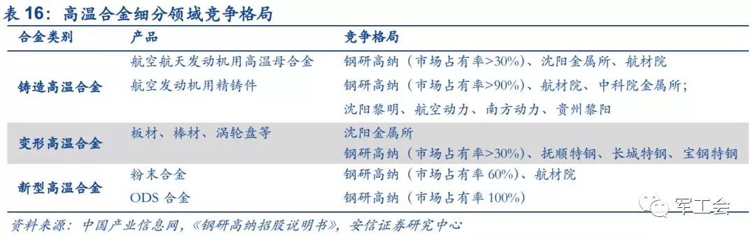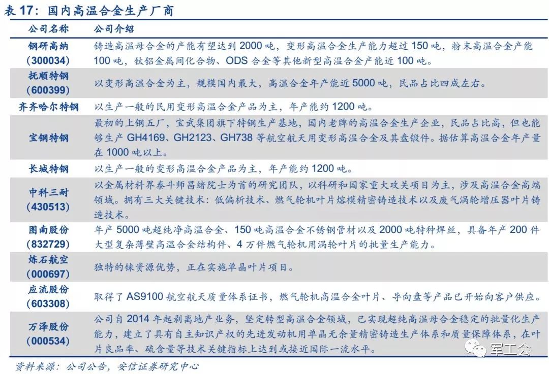 经过50多年发展,我国已经形成了比较先进,具有一定规模的生产基地。国内厂商主要包括钢研高纳、抚顺特钢、齐齐哈尔特钢、宝钢特钢、长城特钢、中科三耐、图南股份、炼石航空、应流股份和万泽股份等企业,这些大型钢企拥有大吨位冶炼设备以及变形加工能力,主要生产在航空航天领域用量最大的变形高温合金,因此在大批量生产高温合金母合金、板、棒、锻材上有很大的优势。