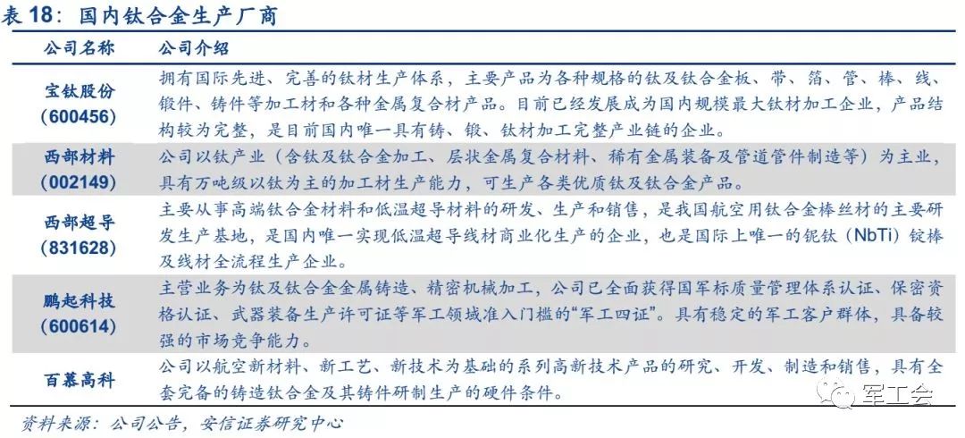 国际领域主要的钛合金生产商有美国钛金属公司(Titanium Metals Corporation)、俄罗斯(VSMPO-AVISMA)、日本东邦钛公司(Toho Titanium)、住友公司尼崎分公司等,在技术上拥有较大优势。在军用领域,由于准入条件限制,这些企业与国内企业并无竞争关系;国内市场集中度很高,2014年我国生产航空航天领域用钛销售量合计4861吨,其中宝钛股份、西部超导和西部材料三家企业继续稳居行业前三甲,占比合计81%。