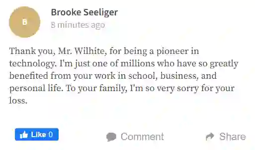 「谢谢你,Wilhite先生,你是一位可敬的科技先驱。我只是几百万因为你的发明而在学校、工作、生活受益的人之一。Wilhite先生的家人们,节哀。」