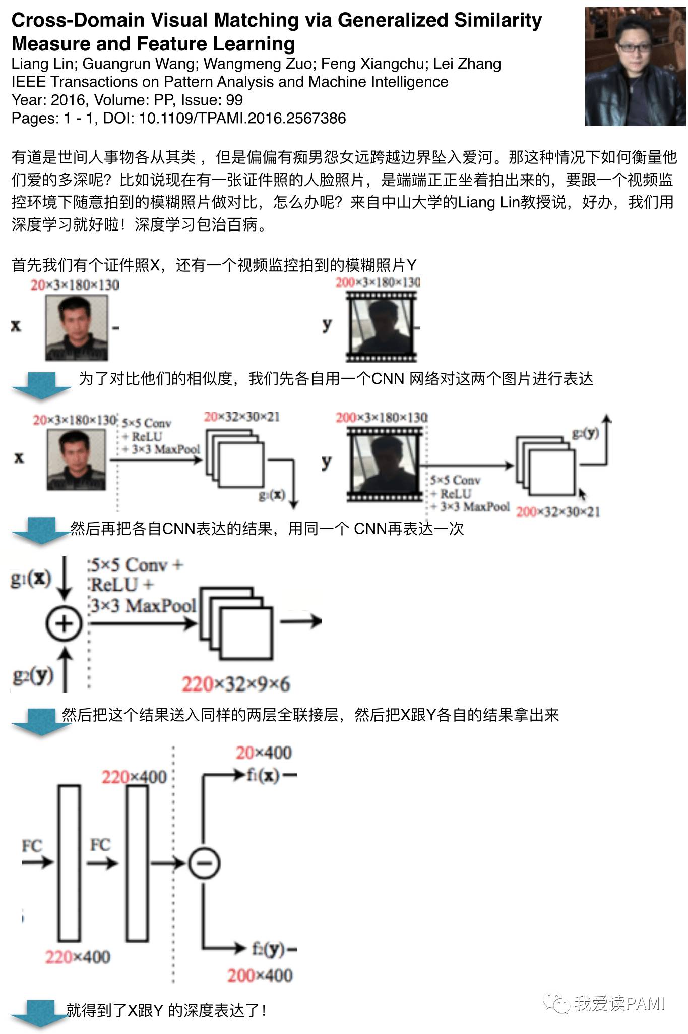 有道是世间人事物各从其类 ,但是偏偏有痴男怨女远跨越边界坠入爱河。那这种情况下如何衡量他们爱的多深呢?比如说现在有一张证件照的人脸照片,是端端正正坐着拍出来的,要跟一个视频监控环境下随意拍到的模糊照片做对比,怎么办呢?来自中山大学的Liang Lin教授说,好办,我们用深度学习就好啦!深度学习包治百病。