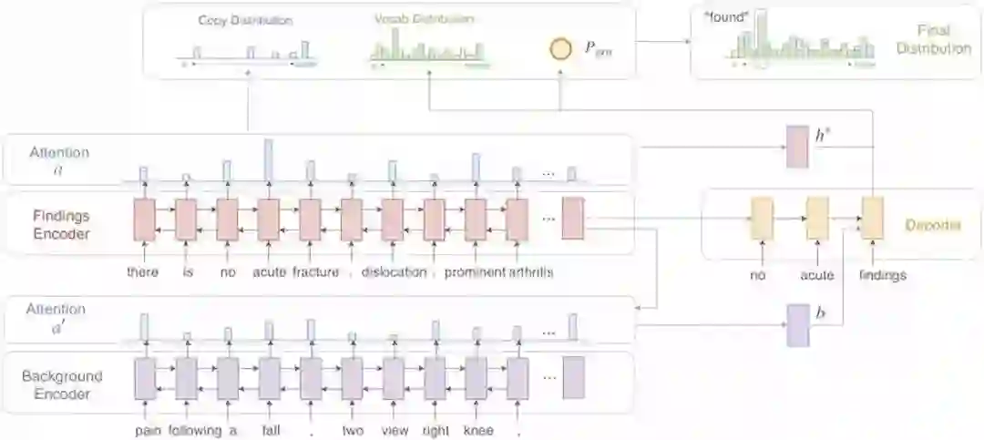 该研究将诊断报告的自动生成看作了一个“文本概括”问题。长篇的病情记录被视作需要概括的文本,而这一概括过程又需要结合患者的病史信息。