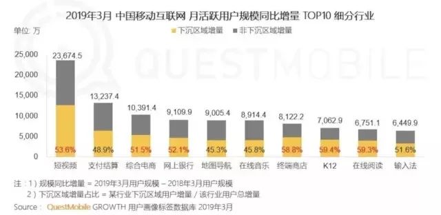 在用户增长方面,全国每月活跃用户增长前 10 的行业中,前 6 个行业的新增用户中有一半左右来自三线或三线以下城市。以短视频行业为例,过去一年里来自三线或三线以下城市新增用户的比例为 46.4%。